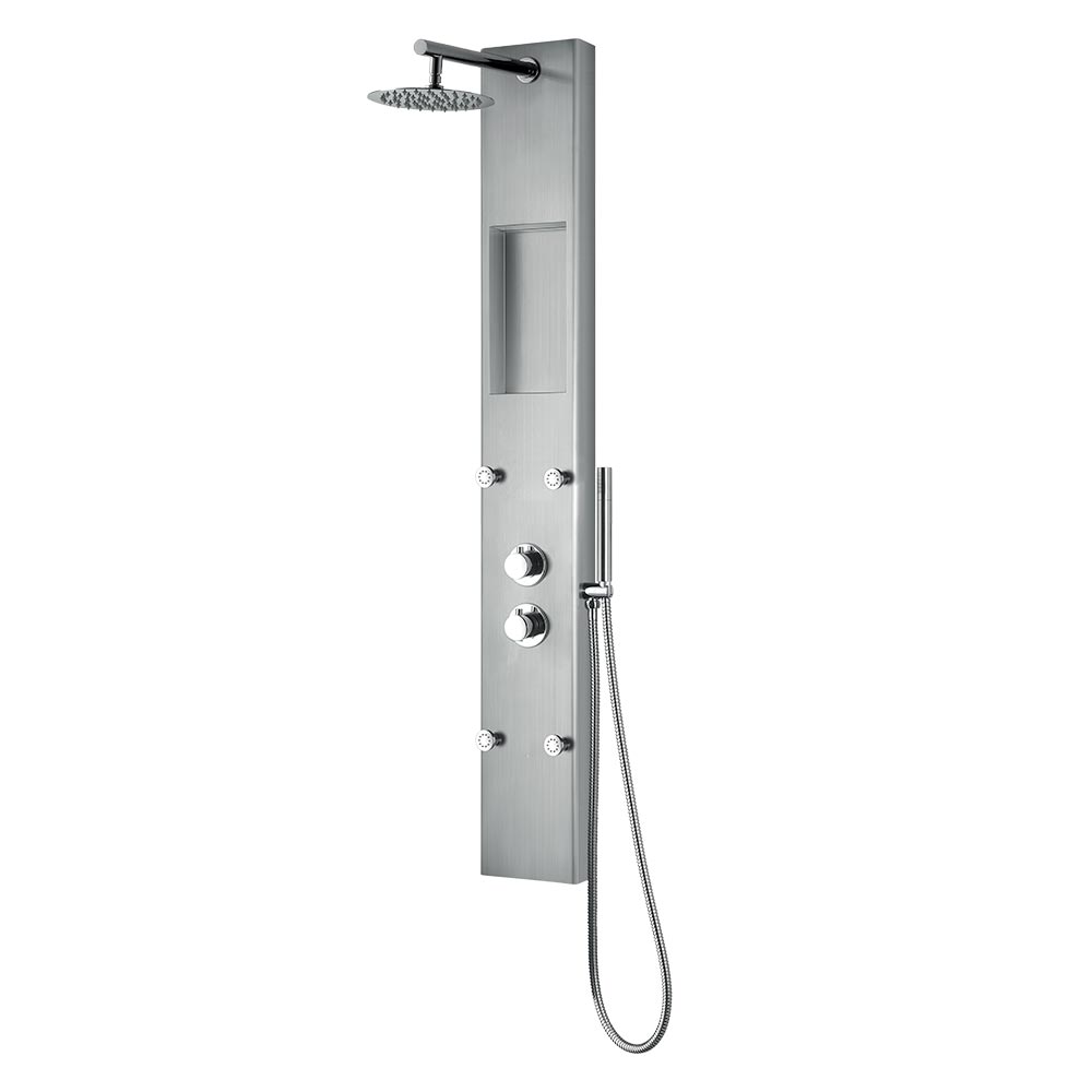 Colonne de douche à fixer au mur. Elle est dotée d’un panneau en acier inox avec 4 buses verticales, d’une douchette de confort en cuivre. Réglage 3 positions. Boutons de commande en zinc.