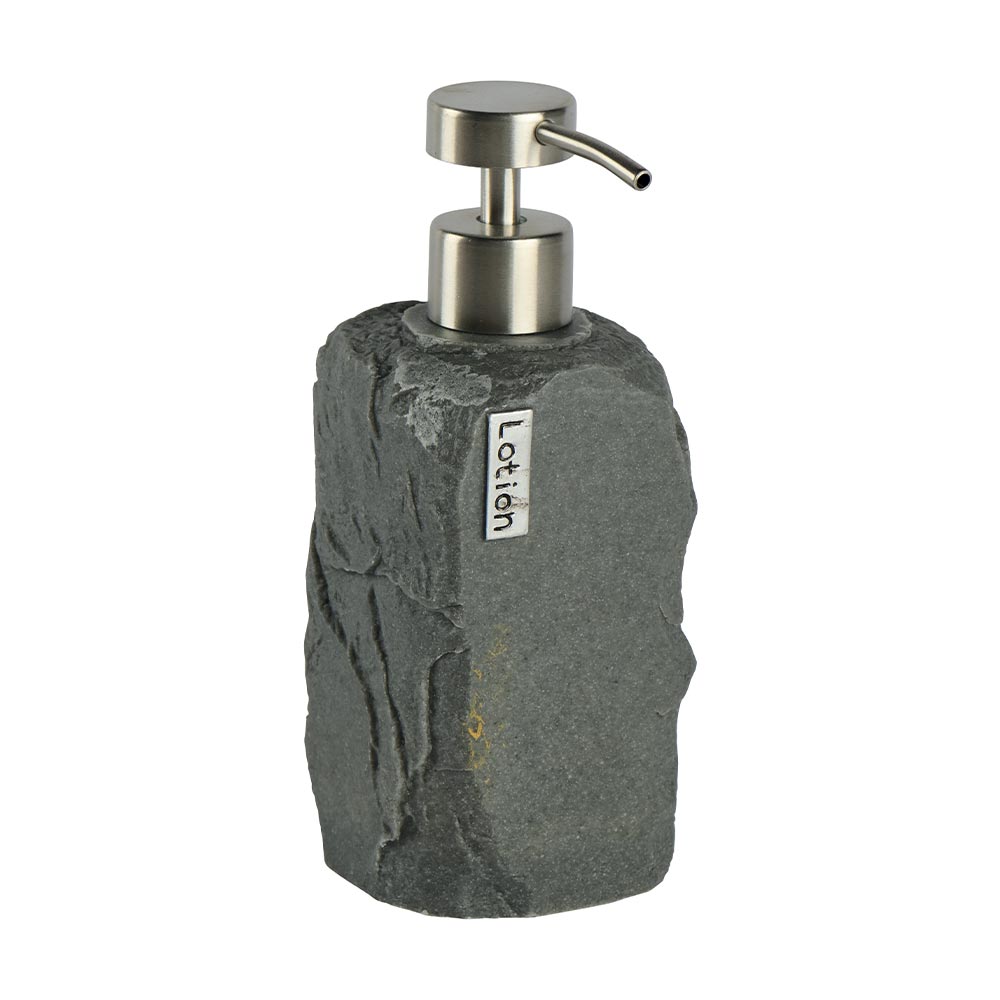 Distributeur de savon en résine imitation pierre grise et pompe en acier inoxydable.